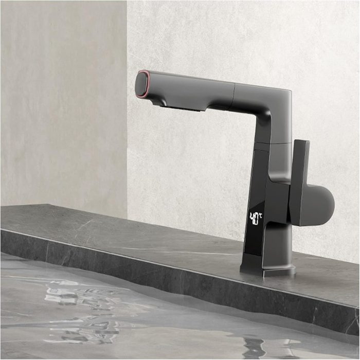 Baterie Lavoar cu Afisaj Digital, Temperatura Apei, Pipa Extractabila, Rotire 360, 2 Functii, Negru
