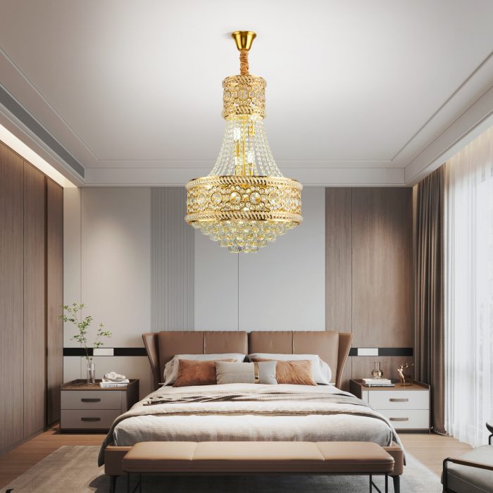 Candelabru Royal auriu cu 9 becuri E14, diametru 40 cm, înălțime reglabilă. Ideal pentru living elegant, dining sau spații luxoase.