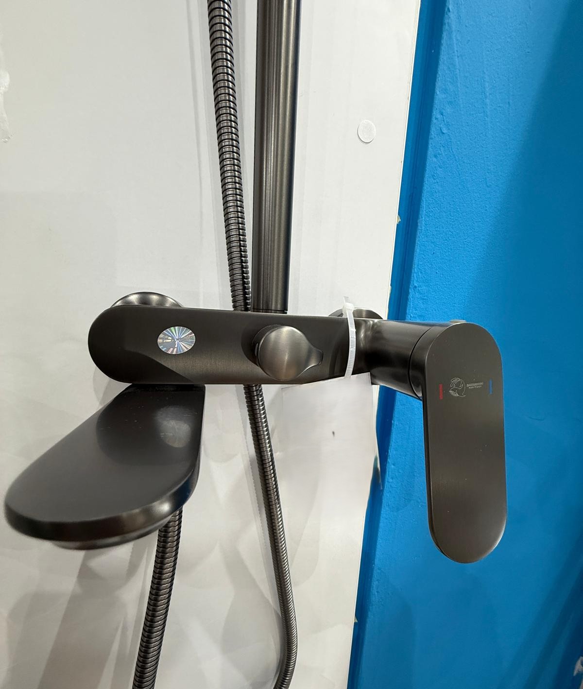 Transformă baia ta într-un spațiu de relaxare cu Coloana de duș cu baterie încorporată, un sistem complet ce oferă 3 funcții esențiale: palarie de duș, pară de duș și baterie pentru cadă. Cu un design elegant gri antracit și o construcție durabilă din alamă, această coloană de duș este perfectă pentru un decor modern și sofisticat.