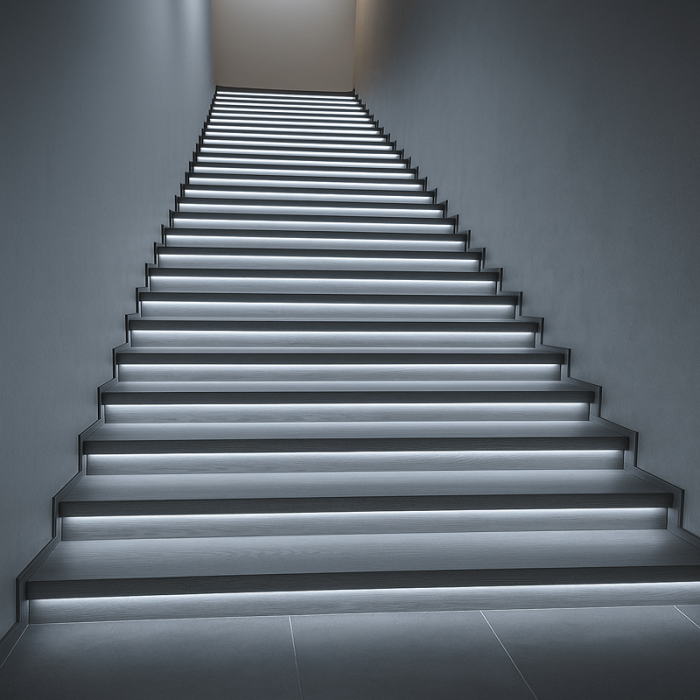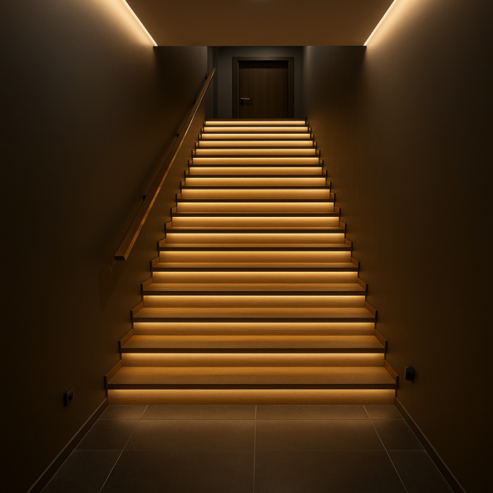 ✔ Iluminare uniformă – Banda LED COB oferă 320 LED/m, oferind o lumină clară și constantă pe toate treptele.