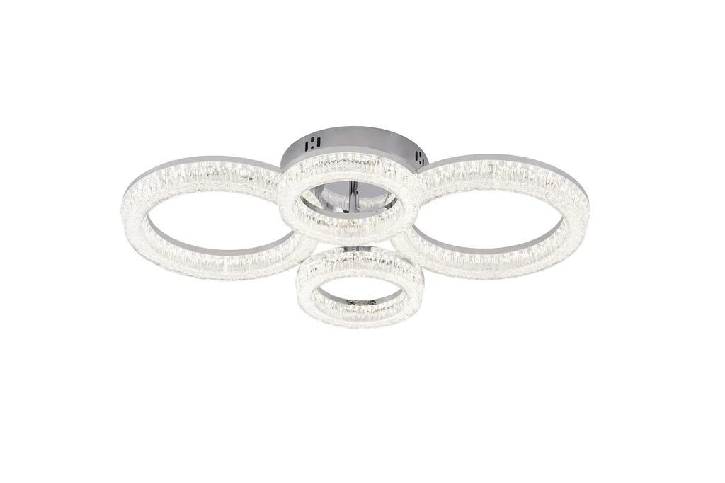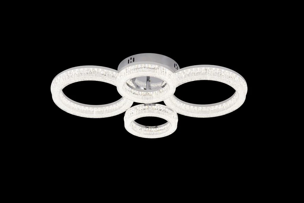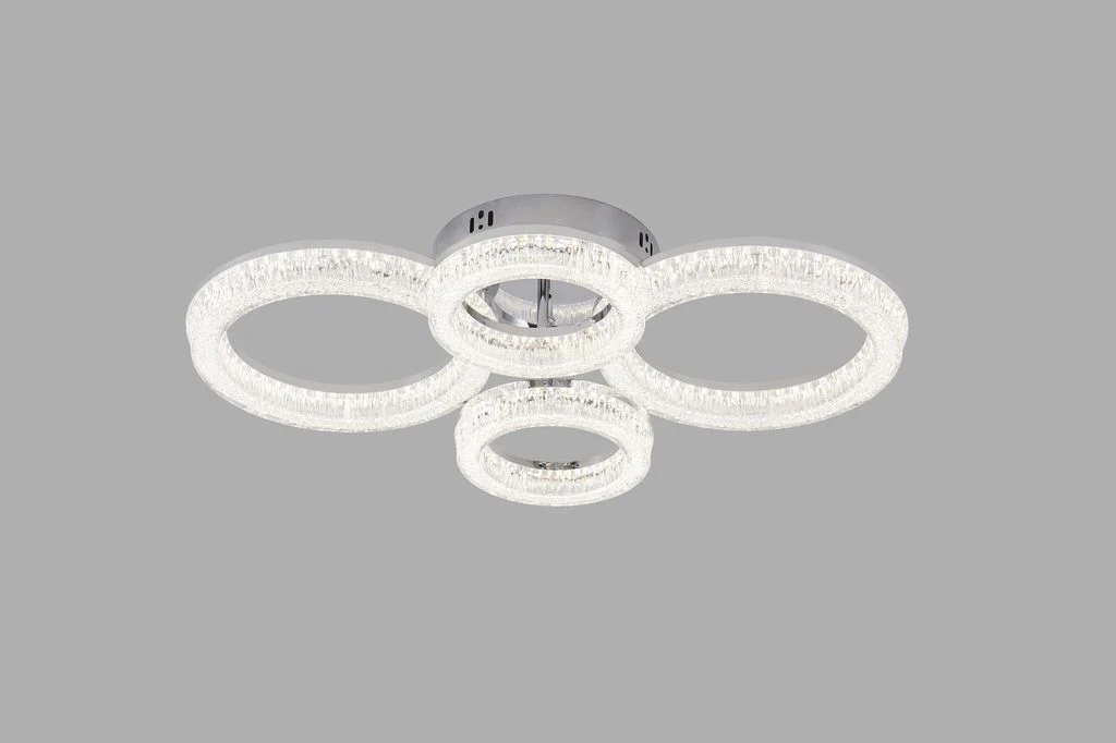 Lustră LED cu 4 cercuri, 120W, finisaj argintiu, telecomandă inclusă. Oferă 3 tipuri de lumină și intensitate reglabilă, design modern circular și iluminare uniformă, ideală pentru livinguri sau birouri.