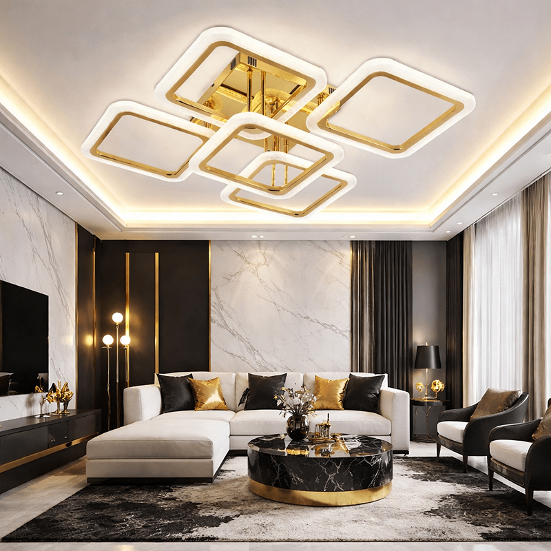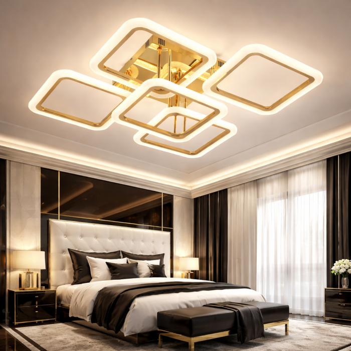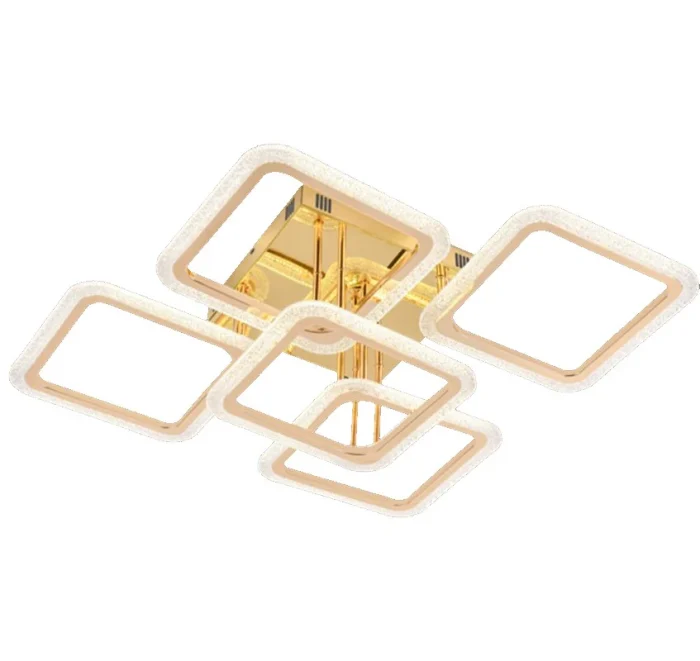 Lustră LED 5 Patrate Aurii 130W cu Telecomandă, Dimabilă, 3 Tipuri de Lumină – Design Modern