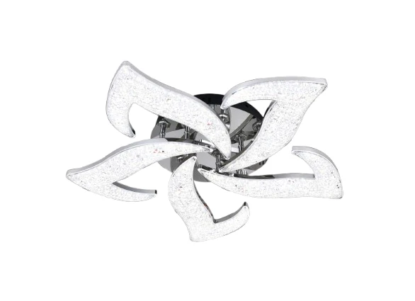 Lustră LED cu 5 petale argintii, 100W, telecomandă inclusă, 3 tipuri de lumină și intensitate reglabilă. Design modern elegant, iluminare puternică și consum redus, ideală pentru livinguri sau dormitoare spațioase.