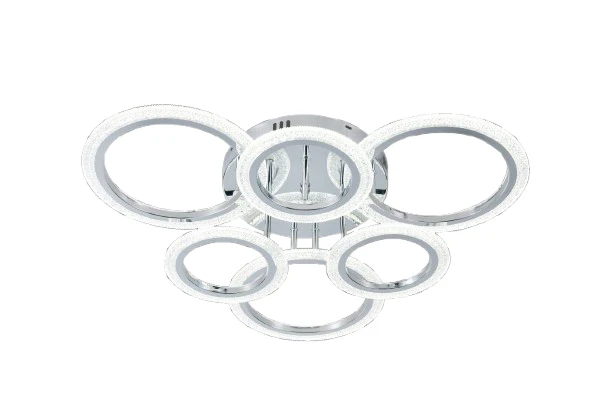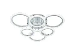 Lustră LED cu 6 cercuri crom, 132W, telecomandă inclusă, 3 tipuri de lumină și intensitate reglabilă. Design modern circular, iluminare puternică și uniformă, ideală pentru livinguri mari sau birouri.
