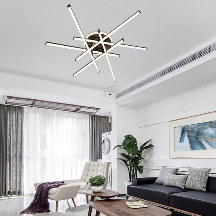 Lustră LED 98W, maro coffee, 6+1 surse, cu telecomandă, 3 tipuri de lumină (3000K–6000K), intensitate reglabilă, dimensiuni 805x760x165 mm.