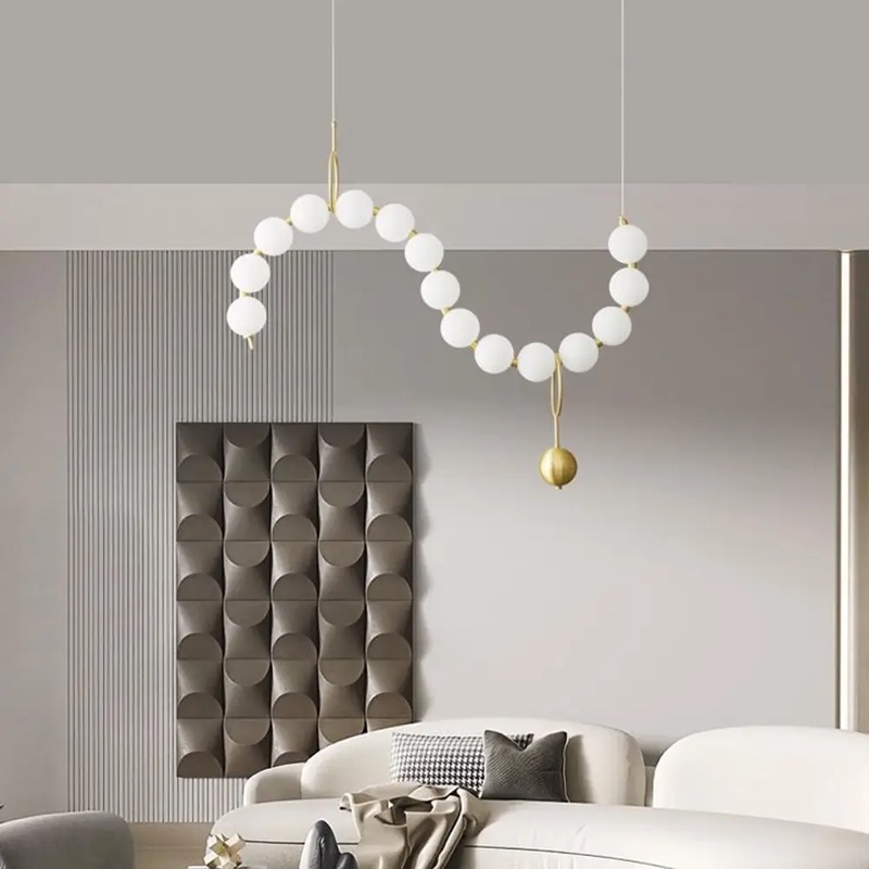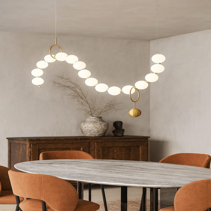 Lustră LED suspendată cu 15 abajururi albe, structură metalică aurie, putere 80W. Trei tipuri de lumină (caldă, neutră, rece), schimbabile din întrerupător. Lungime și înălțime ajustabilă până la 1.5 metri. Ideală pentru living, dining sau spații elegante.
