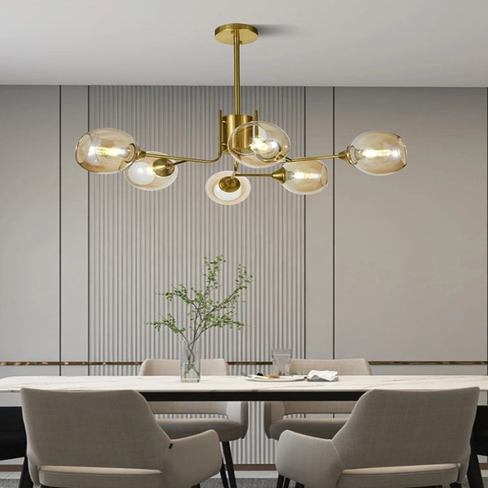 Adaugă un plus de eleganță și rafinament casei tale cu lustra N6802-6, prevăzută cu 6 abajururi din sticlă și structură din metal rezistent cu finisaj auriu premium. Designul său modern și minimalist se potrivește perfect în living, dining, dormitor sau birou. Funcționează cu becurile standard E27 (neincluse), oferind libertate în alegerea intensității și temperaturii luminii.