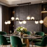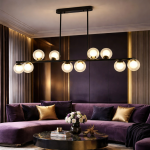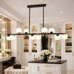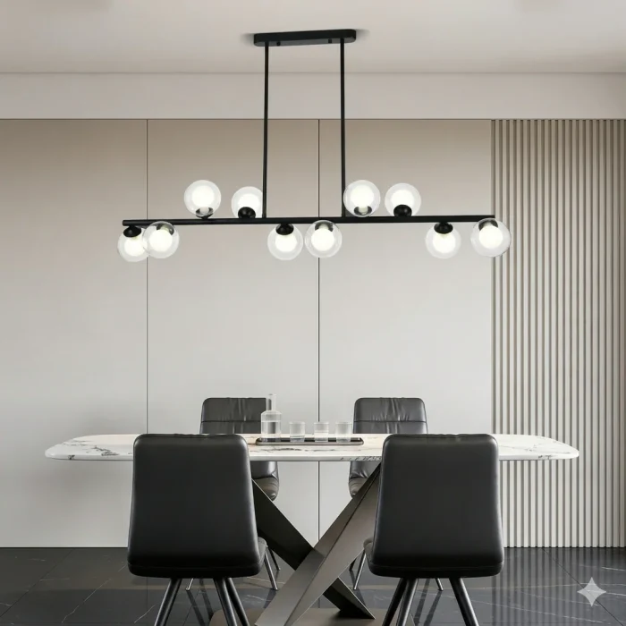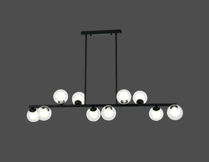 Lustra suspendată cu 10 abajururi și soclu G9 este un corp de iluminat modern, ideal pentru interioare elegante și contemporane. Designul alungit și echilibrat o face perfectă pentru iluminarea uniformă a spațiilor mari, precum dininguri sau livinguri open-space.