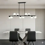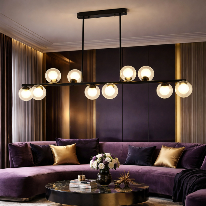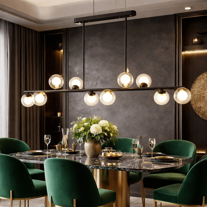 Lustră suspendată modernă cu 10 becuri G9 și abajururi din sticlă. Ideală pentru dining, living sau spații open-space.
