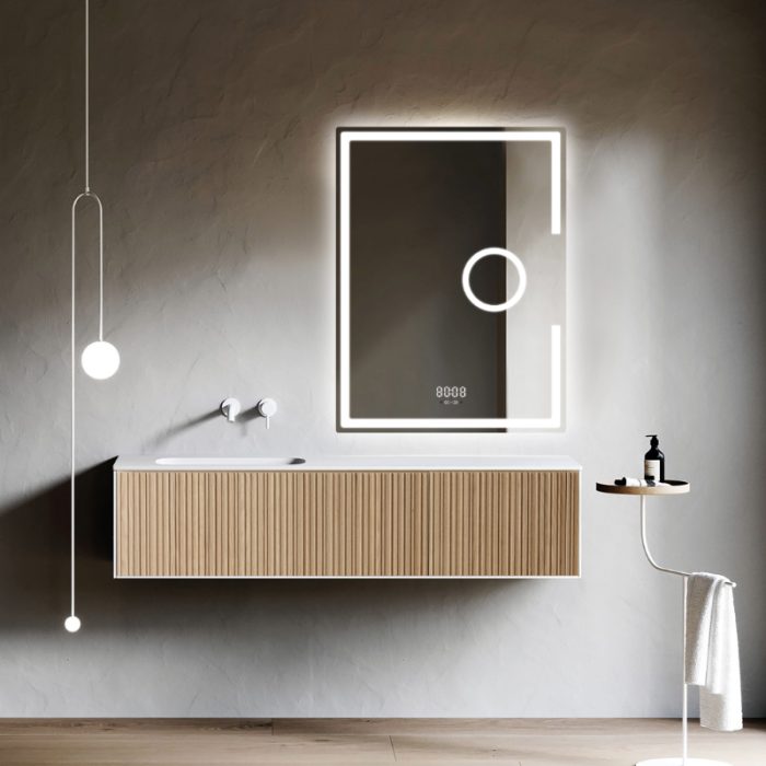 Oglinda LED 60×80 cm cu Lupa Cosmetica, Senzor Miscare Premium – 3 Tipuri de Lumina, Dimabila, Ceas & Temperatura, Dezaburire