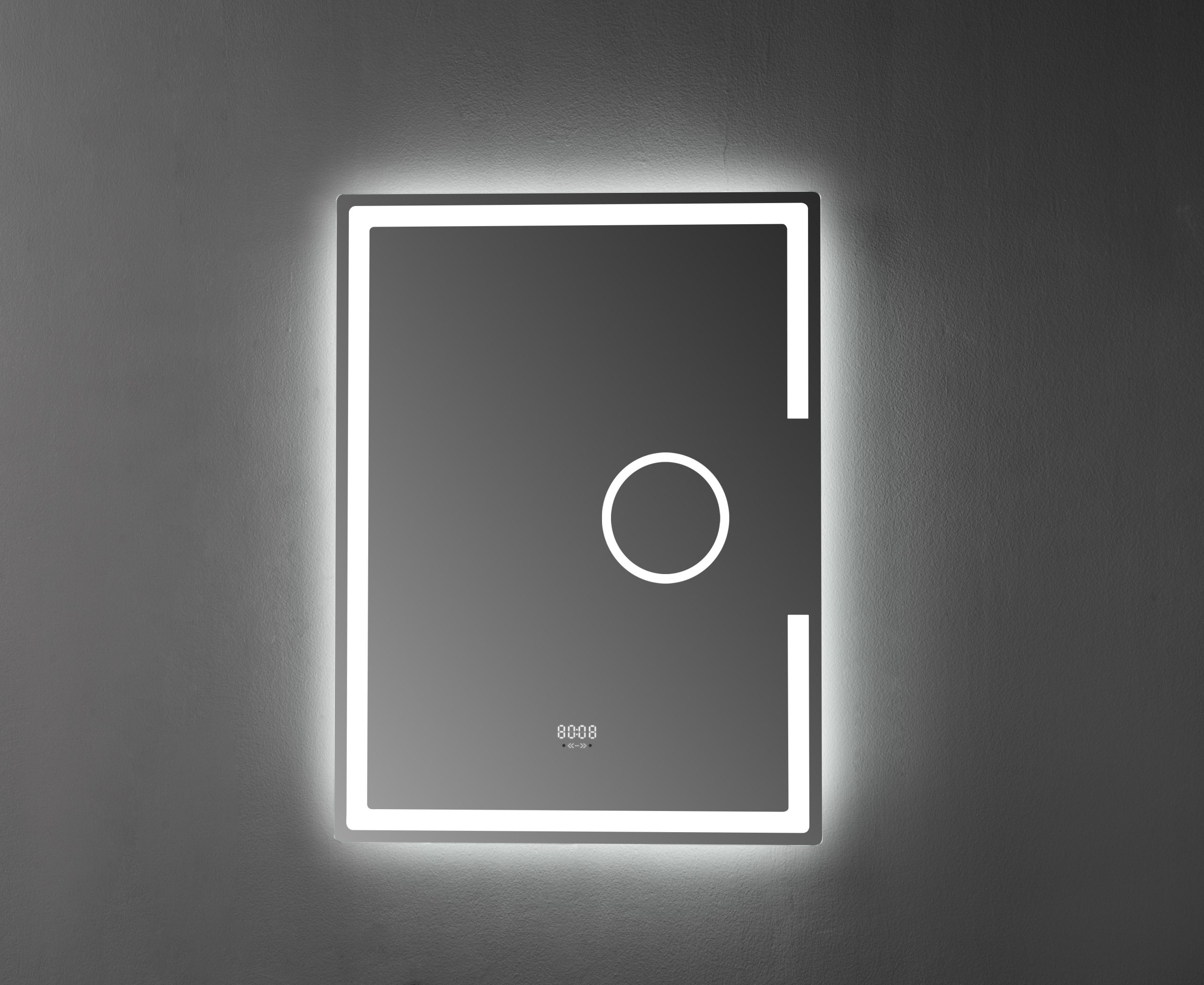 Oglindă LED dreptunghiulară 60×80 cm, 3 tipuri de lumină, dimabilă, senzor miscare a mainii, ceas & temperatură, dezaburire automată, IP44, sticlă 5 mm fără cupru. Premium pentru baie.