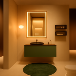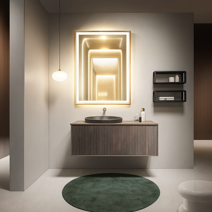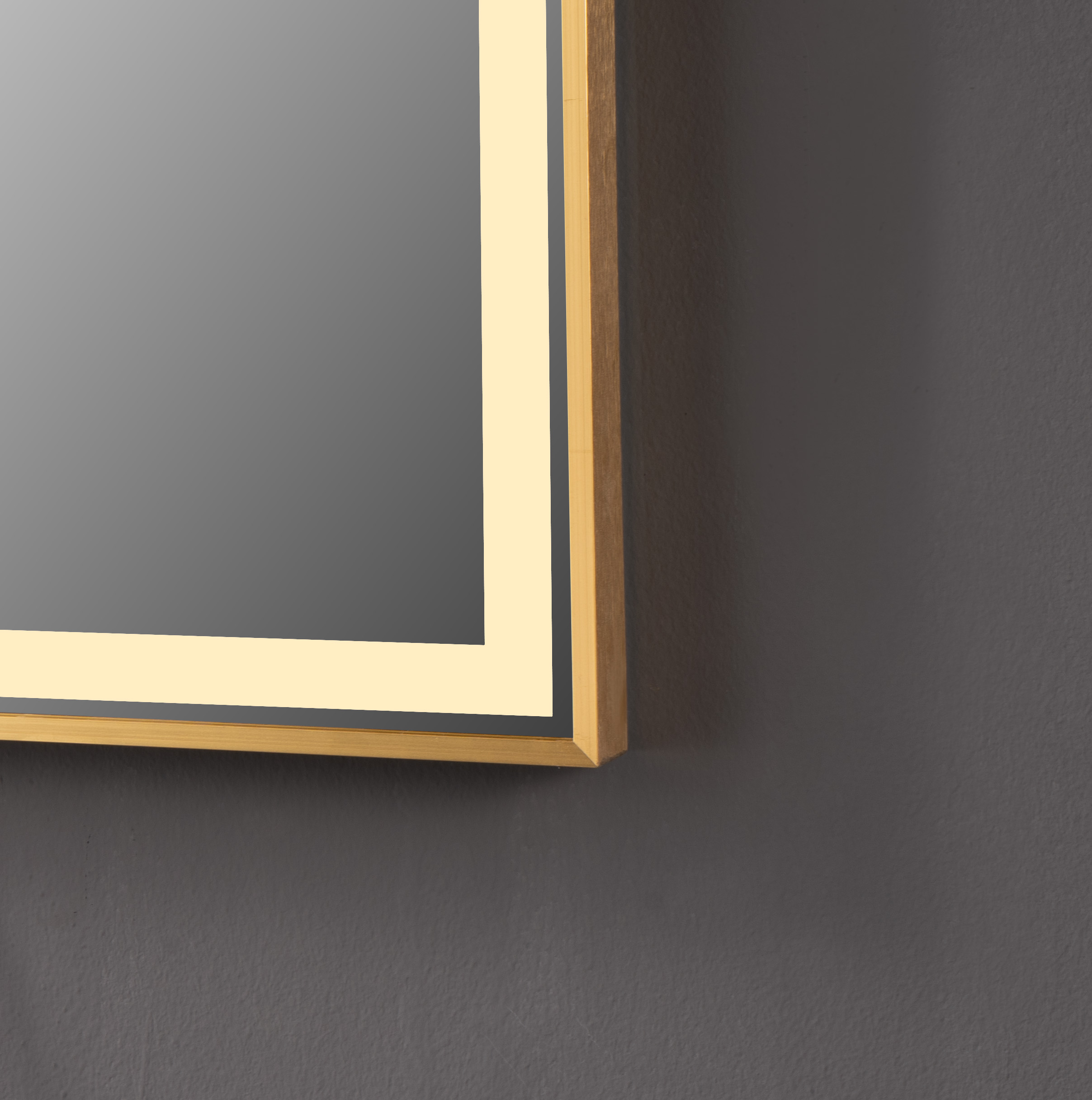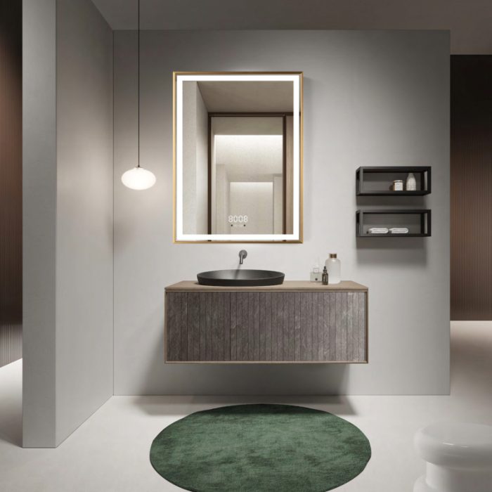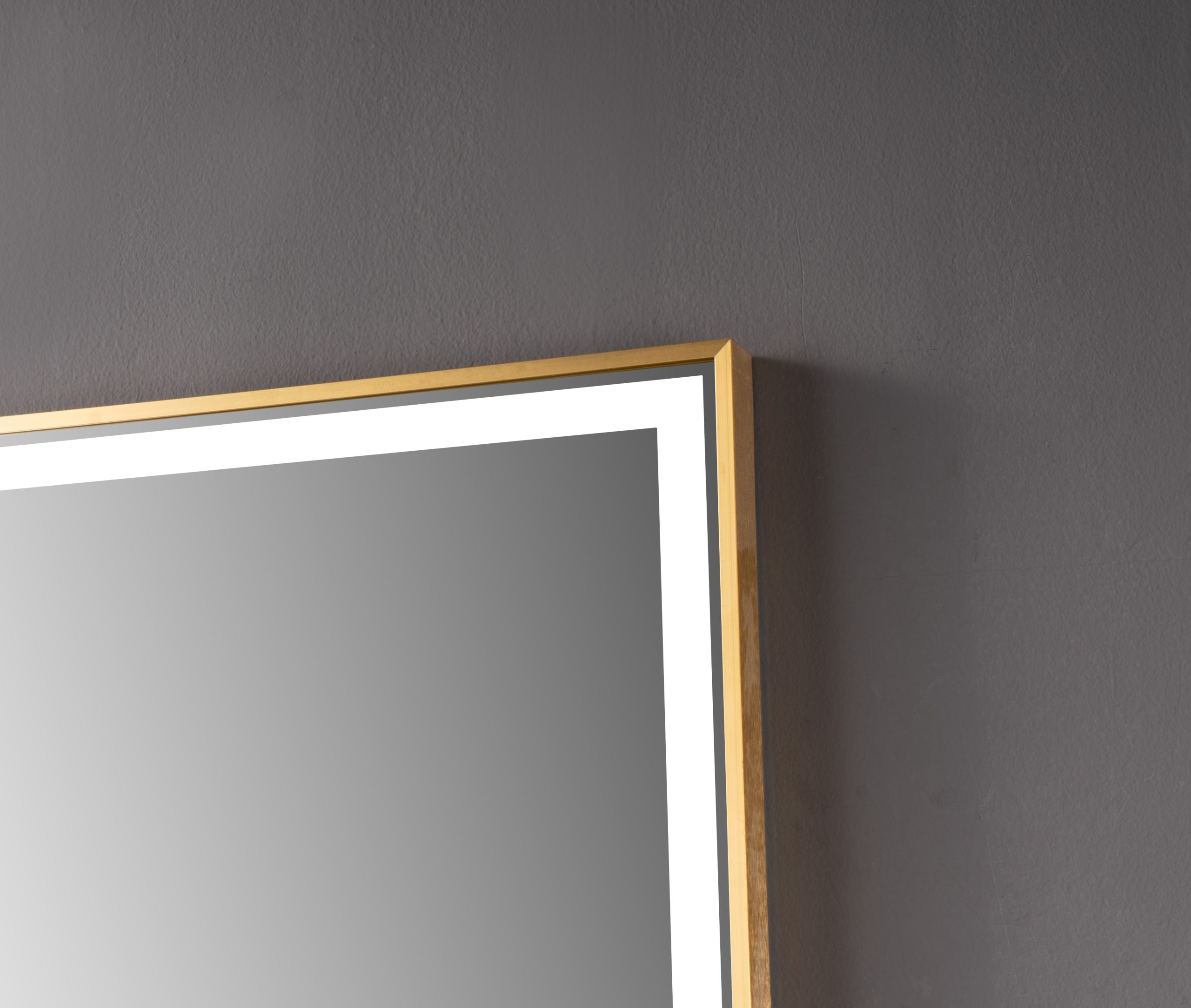 Transformă baia într-un spa modern și funcțional cu oglinda LED dreptunghiulară cu rama aurie premium de 60×80 cm, creată pentru confort, estetică și tehnologie inteligentă. Oglinda este fabricată din sticlă argintie de 5 mm, fără cupru (tehnologie anti-oxidare), cu iluminare dublă (față + margine/spate) și senzori de miscare integrați pentru control total al funcțiilor fara a atinge oglinda.
