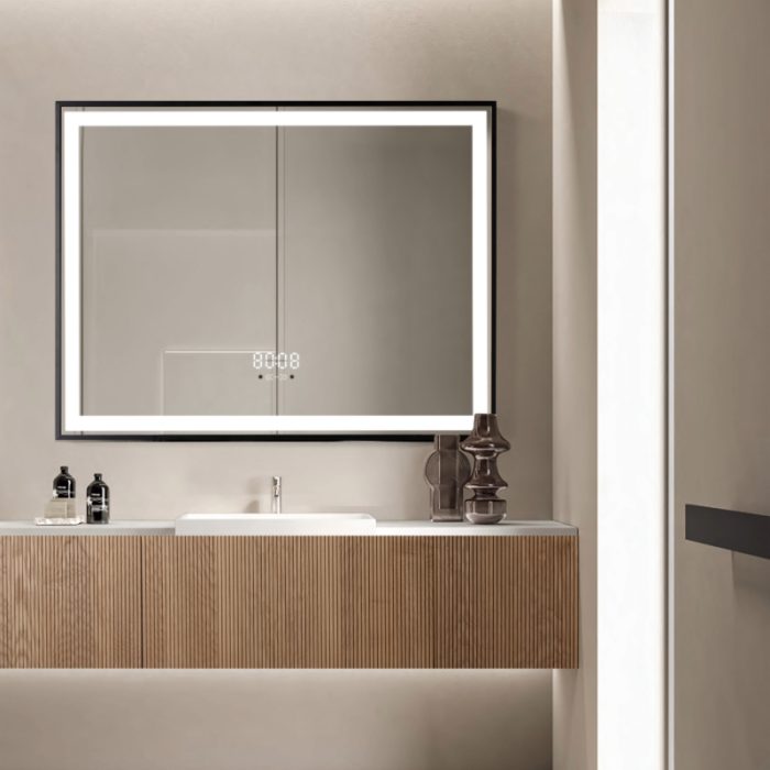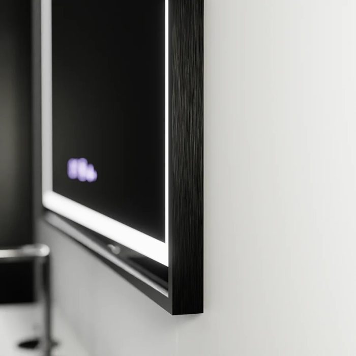 Oglinda LED 80×60 cm cu Rama Neagra, Senzor Miscare Premium – 3 Tipuri de Lumina, Dimabila, Ceas & Temperatura, Dezaburire