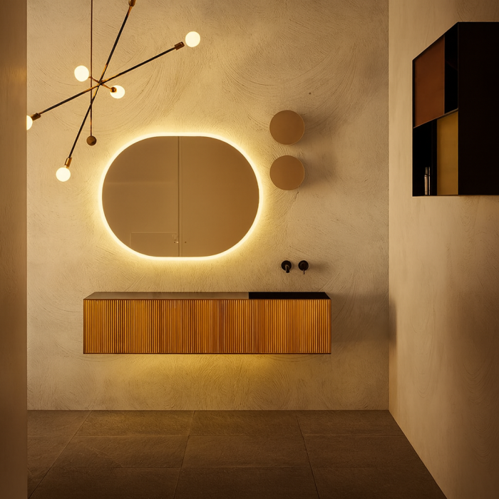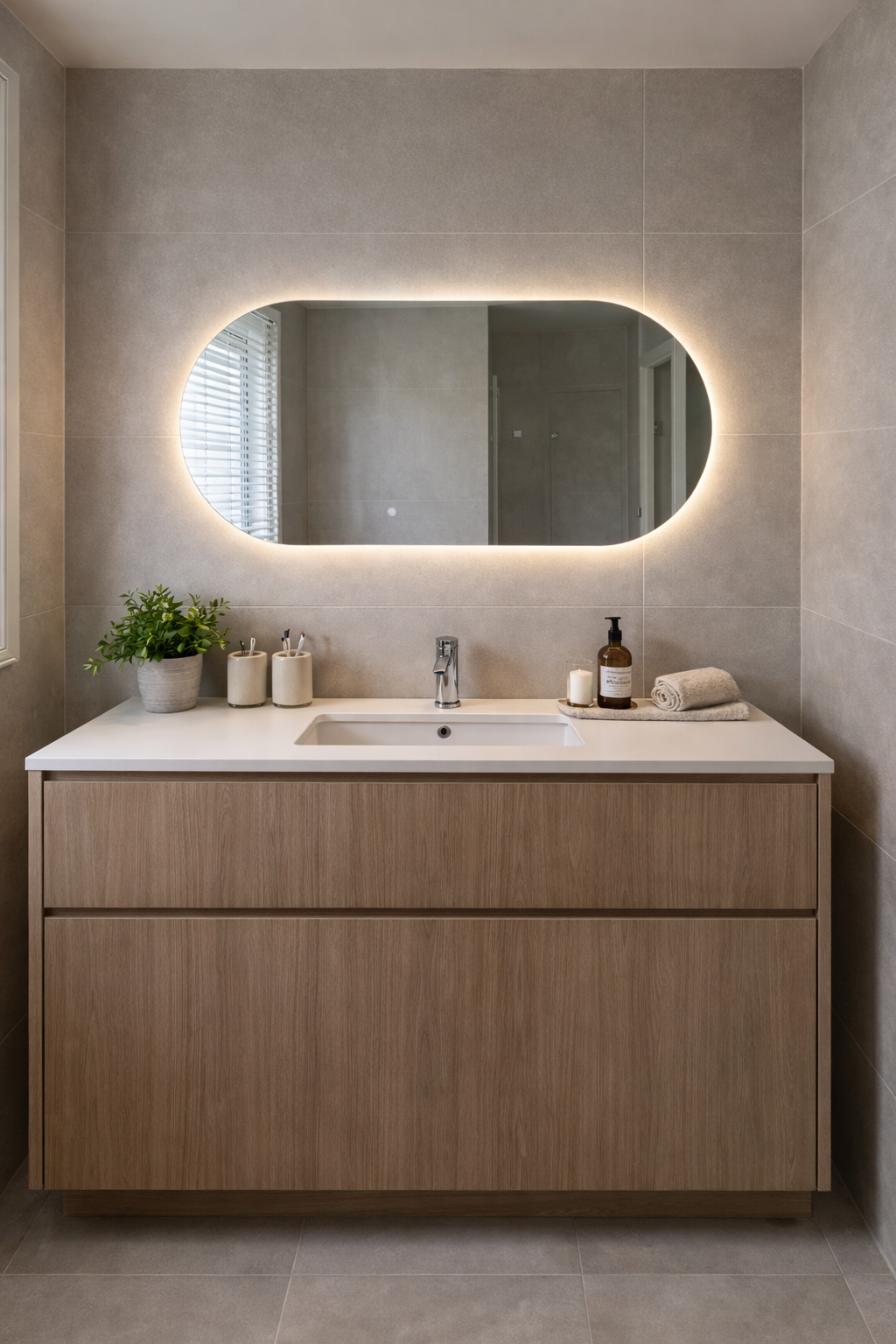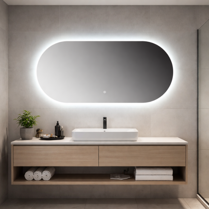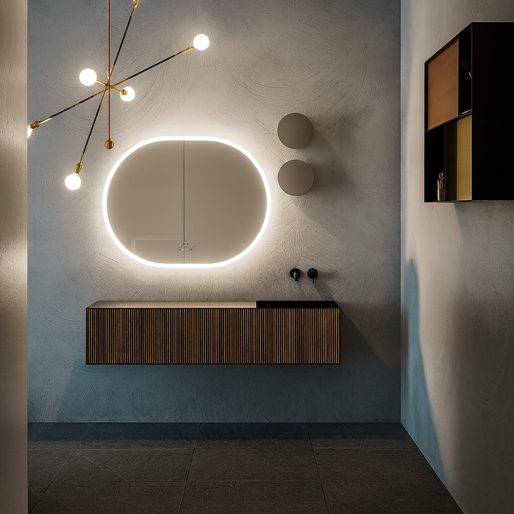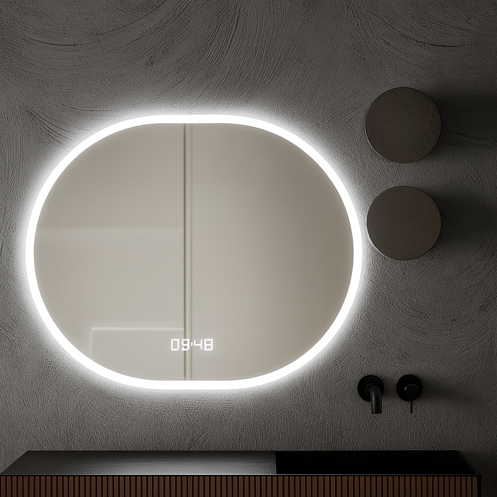 Transformă baia într-un spa modern și funcțional cu oglinda LED ovala premium de 80×60 cm, creată pentru confort, estetică și tehnologie inteligentă. Oglinda este fabricată din sticlă argintie de 5 mm, fără cupru (tehnologie anti-oxidare), cu iluminare dublă (față + margine/spate) și senzori de miscare integrați pentru control total al funcțiilor fara a atinge oglinda.