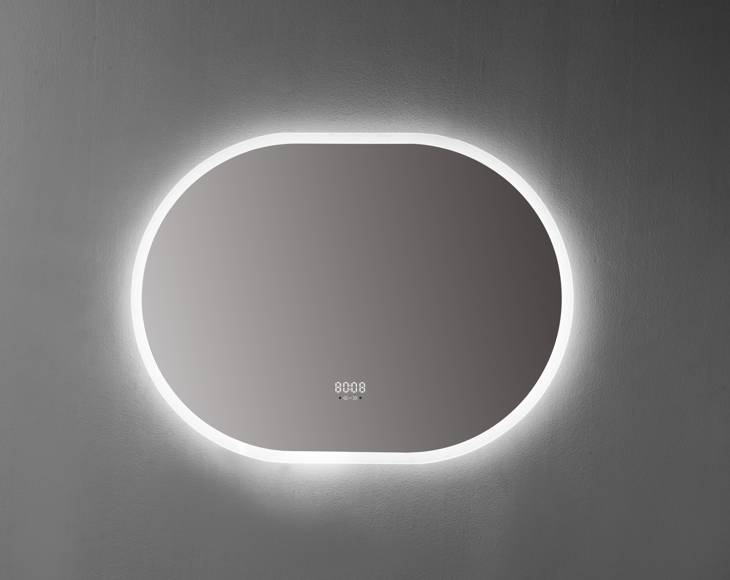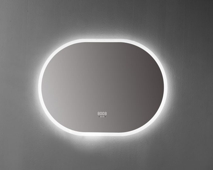 Oglindă LED ovala 80×60 cm, 3 tipuri de lumină, dimabilă, senzor miscare a mainii, ceas & temperatură, dezaburire automată, IP44, sticlă 5 mm fără cupru. Premium pentru baie.