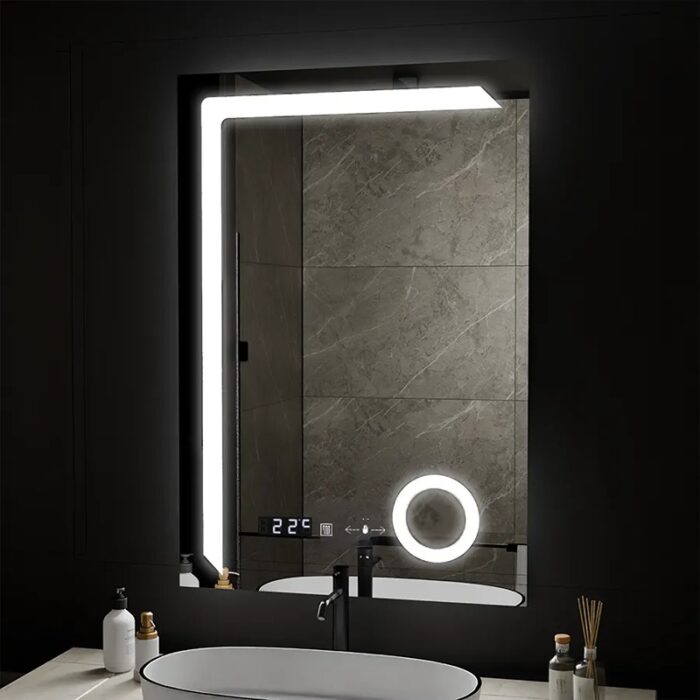Oglinda LED Moderna 60x80cm, Sistem Dezaburire, Ceas & Termometru, Lupa Cosmetica, 3 Tipuri de Lumina, Dimabila