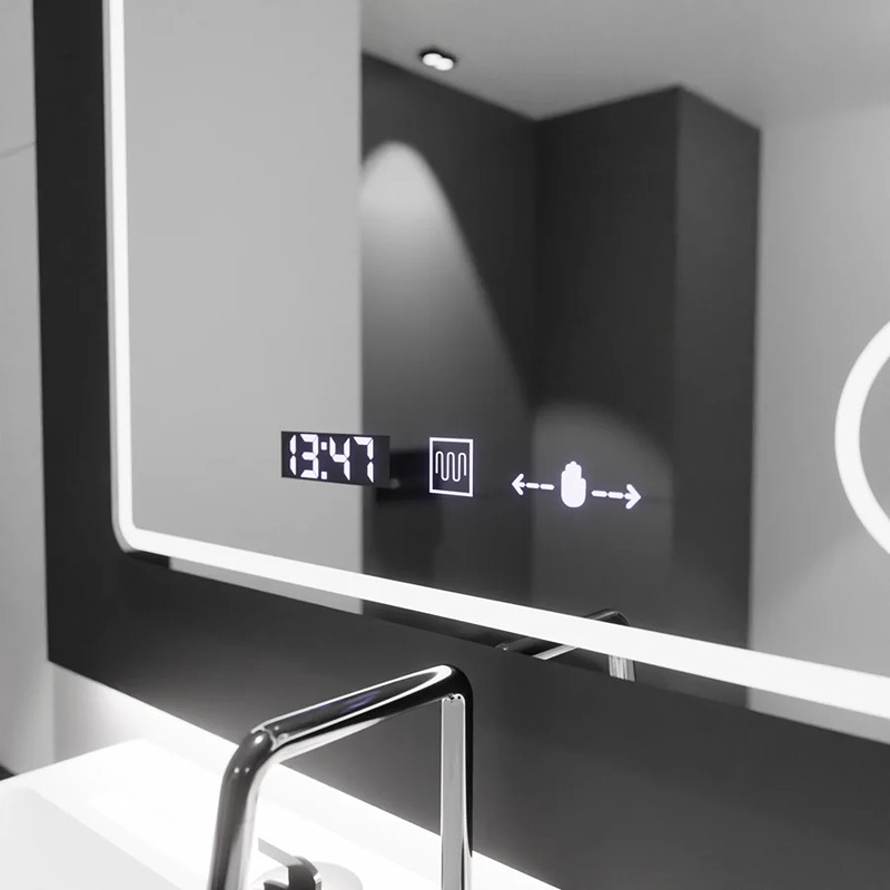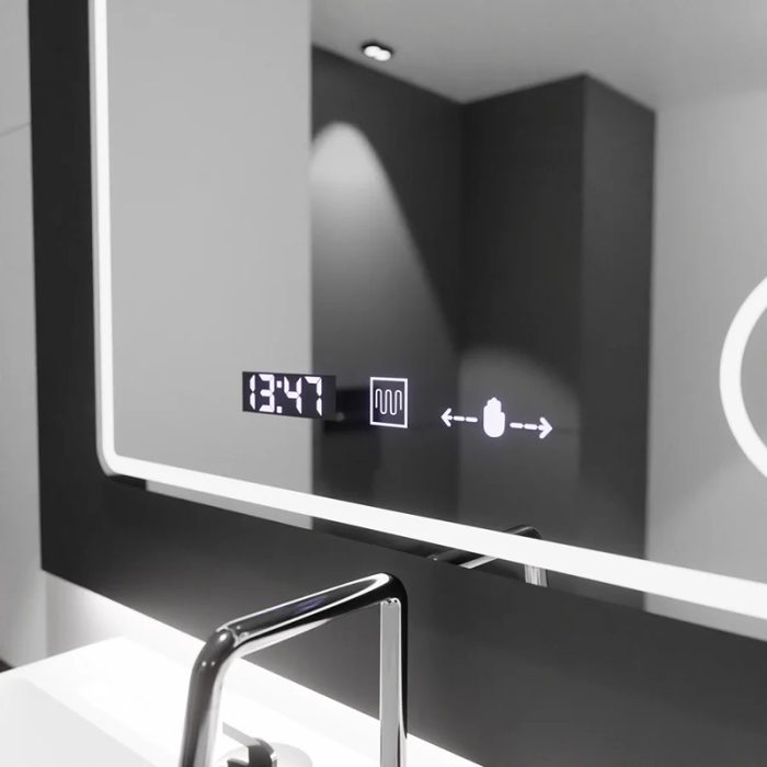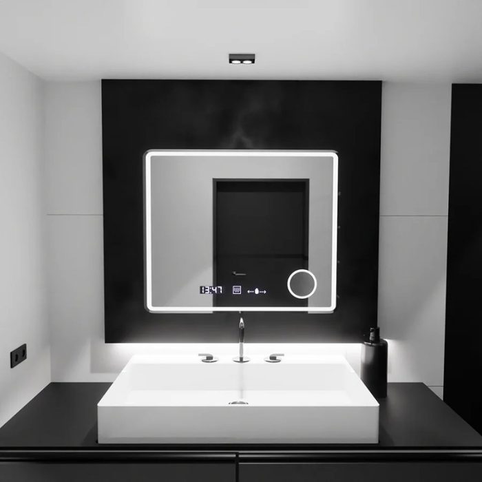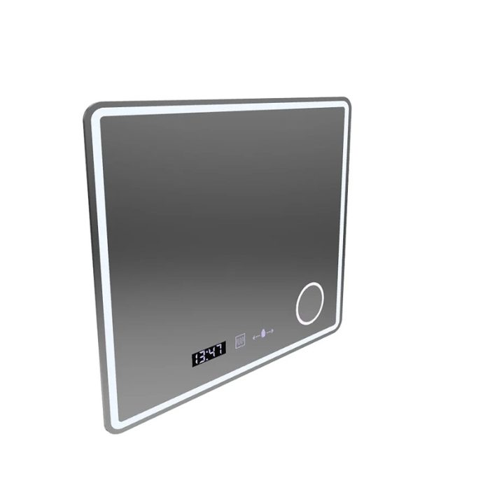 Oglindă LED rectangulară premium 120×80 cm, cu senzor tactil, lupă cosmetică, sistem dezaburire, ceas și termometru. Funcție dimabilă și protecție IP44.