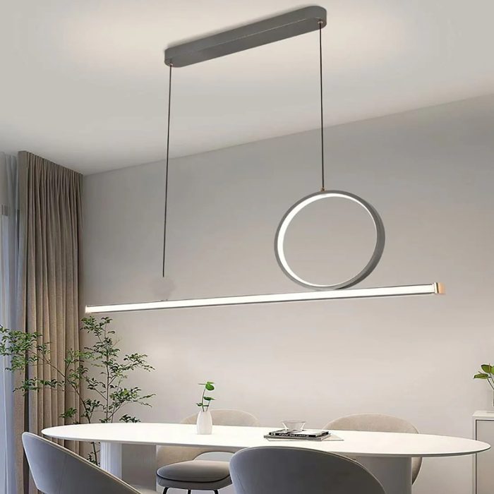 Pendul LED 5102, 116W, culoare gri, cu telecomandă. Oferă 3 tipuri de lumină (3000K-4000K-6500K) și intensitate reglabilă. Înălțime ajustabilă 30–135 cm, dimensiuni 102×7 cm. Material acril + metal, durată de viață >20.000h. Ideal pentru living, dining sau spații moderne.