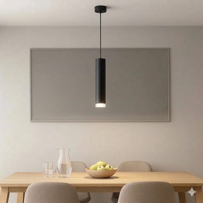 Pendulul suspendat negru cu 1 sursă GU10 este alegerea perfectă pentru interioare moderne și minimaliste. Designul compact și forma cilindrică îl fac ideal pentru iluminatul punctual sau decorativ.