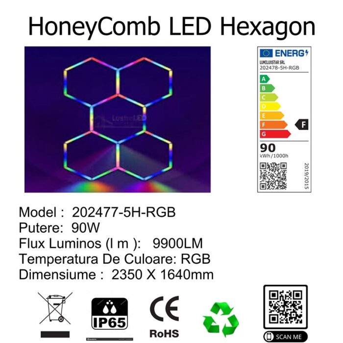 Set 5 HoneyComb LED Hexagon Luminos RGB – Colorat Smart cu Telecomandă 90W 235×164 cm