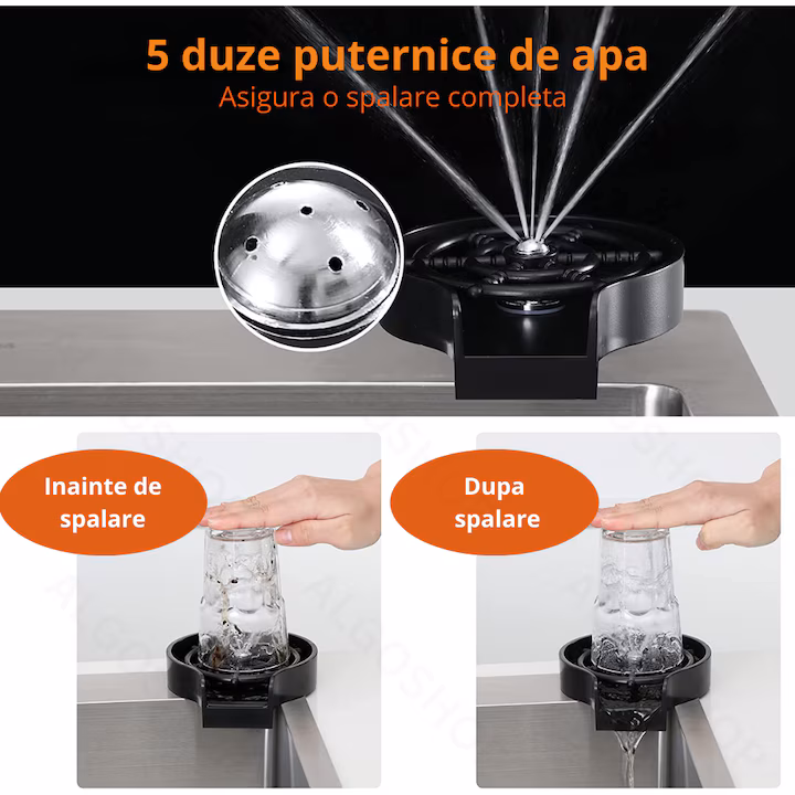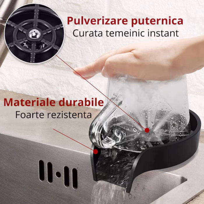 Transformă modul în care cureți paharele cu acest dispozitiv de clătire rapidă, ideal pentru orice bucătărie modernă, bar, restaurant sau acasă. Cu 5 duze de pulverizare și un mecanism ingenios activat prin presiune, spală eficient pahare, căni, biberoane și sticle, în doar câteva secunde.
