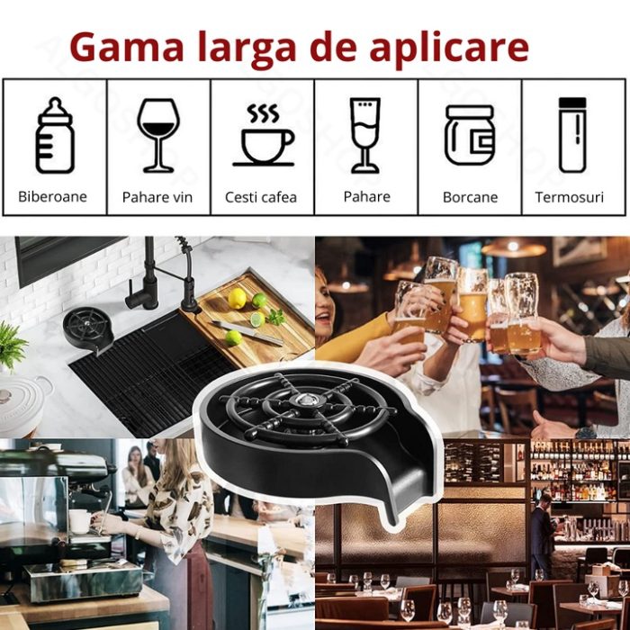 Perfect pentru pahare de vin, termosuri, căni de cafea, biberoane și sticle sport. Un singur gest pentru o clătire impecabilă!
